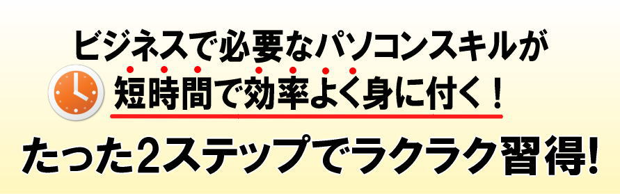 この2ステップ映像学習法により少ない時間と労力でパソコン操作をマスターすることができ、 就職・転職や社内の評価アップの強力な武器となります。