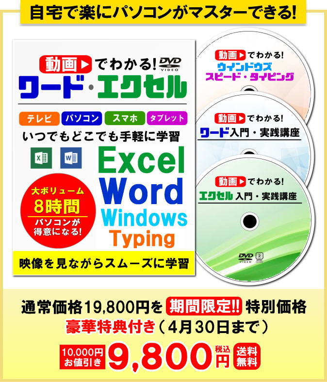 【動画で分かる!ワード・エクセル】では、映像と音声でわかりやすく、パソコン入門から、ウインドウズ、ワード、エクセル、さらにタッチ・タイピングまで学習できるお得なDVD講座です。